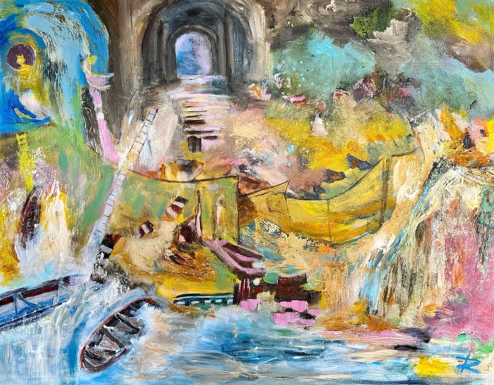 Mich beeindruckt, wie sehr es die innere Bewegung des Stücks aufnimmt, ohne ihn bloß zu illustrieren. Wasser, Brücken, Boote, Treppen, Durchgänge und Portale tauchen unter anderem auf. Dazu Ebenen, in denen alles im Fluss ist und andere, in denen sich etwas staut oder verdichtet.
